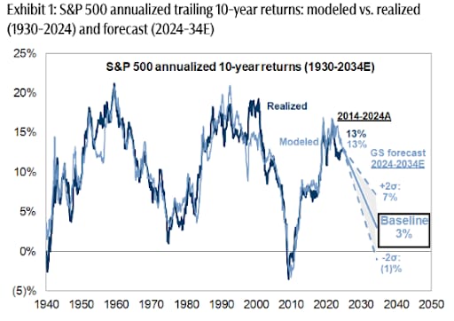 Vanguard just projected public markets may return only 5% annually over the next decade. In a 2024 report, Goldman Sachs forecasted the S&P 500 may return just 3% annually for the same time frame—stats that put current valuations in the 7th percentile of history.